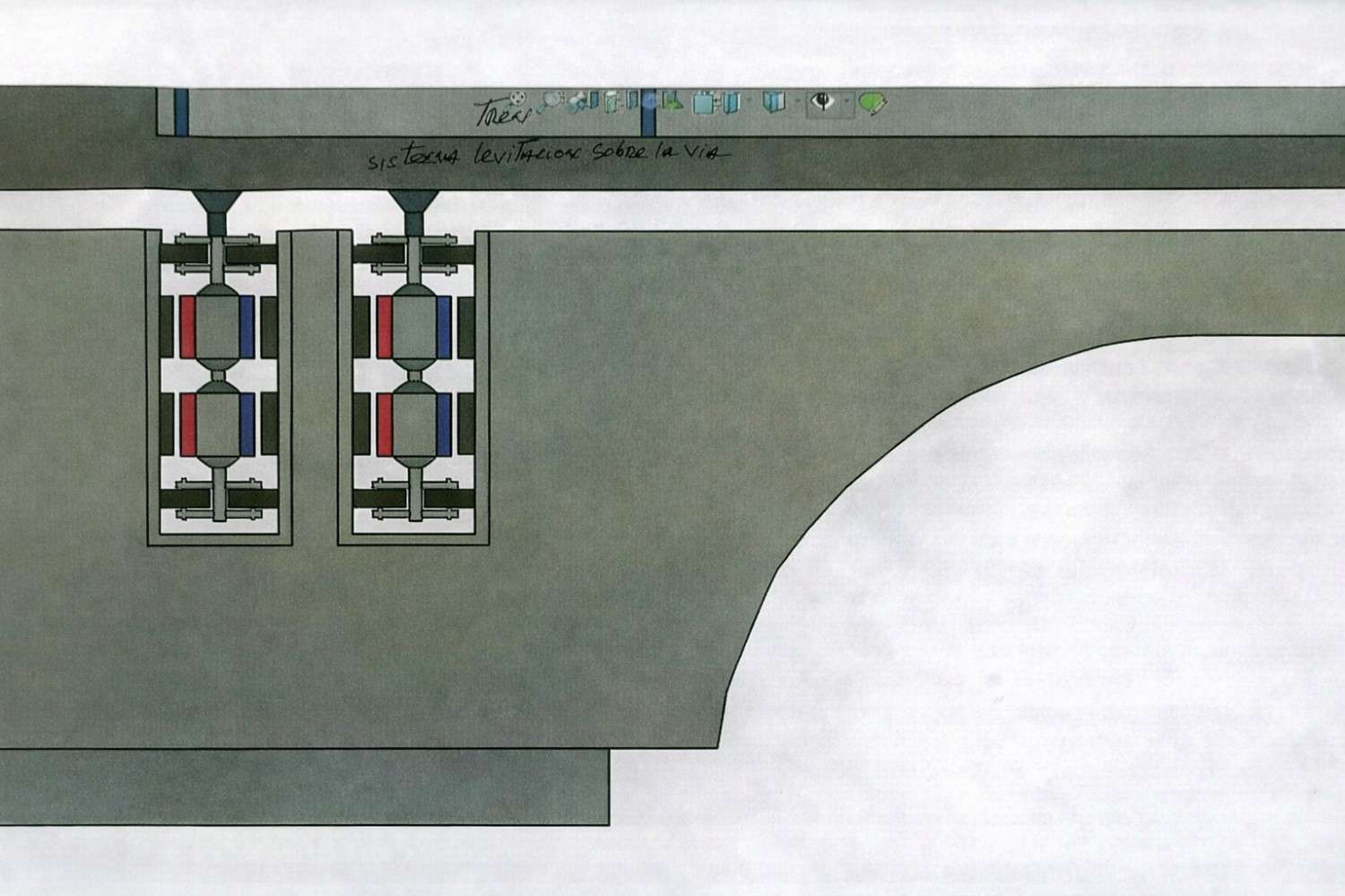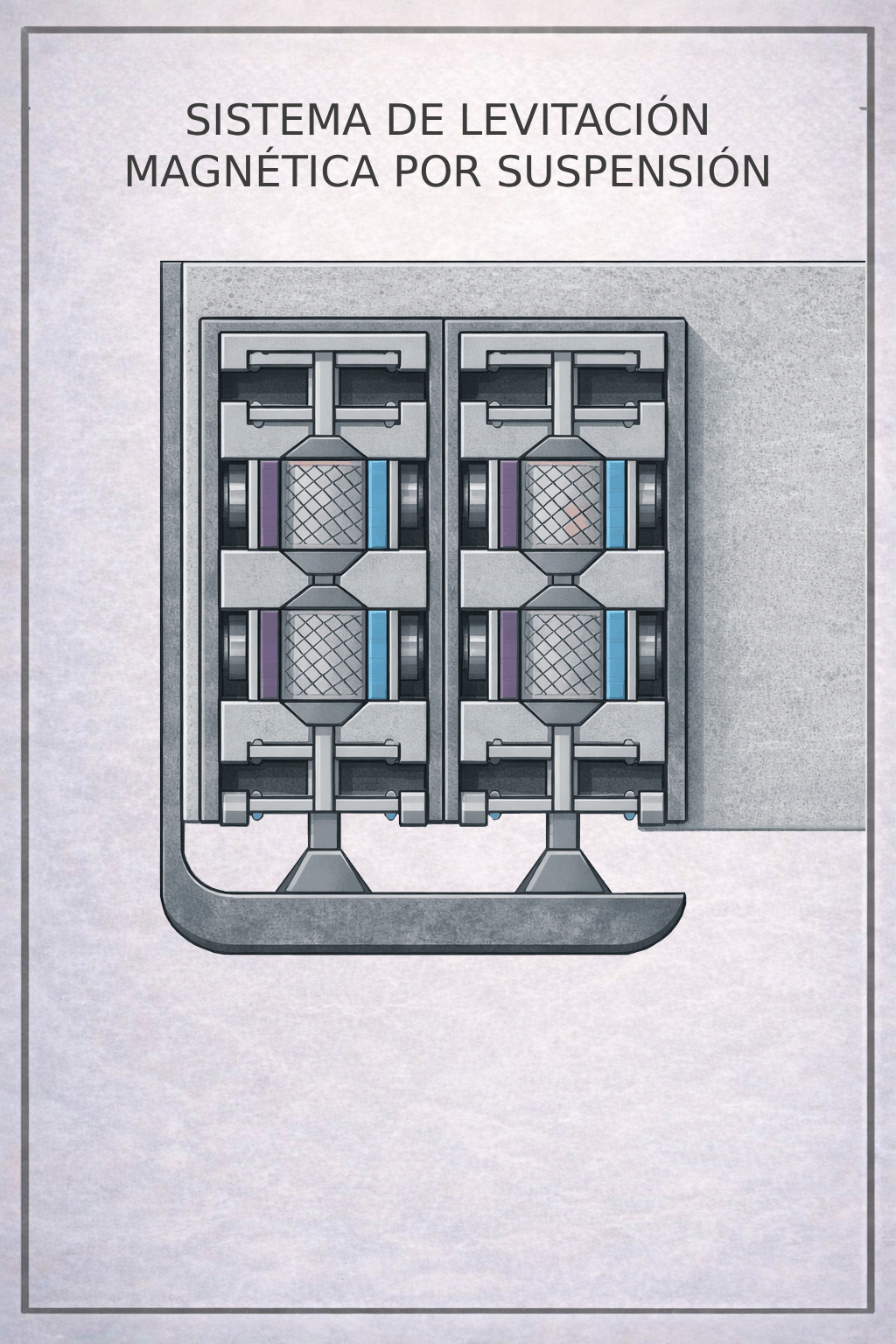Estos esquemas ilustran los principios fundamentales del Parallel Energy Rail System, mostrando cómo la levitación magnética permanente y el riel suspendido trabajan en conjunto para eliminar el contacto mecánico.